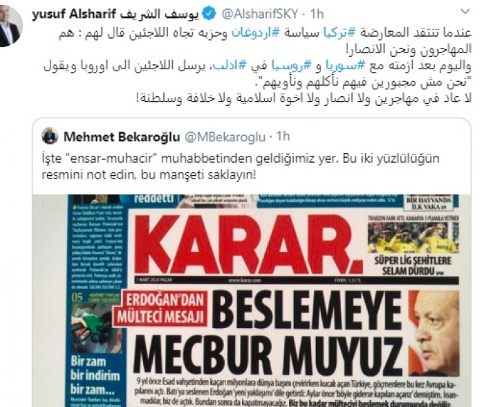 وقال في تغريدة عبر "تويتر" رصدها "المشهد العربي": "عندما تنتقد المعارضة تركيا سياسة أردوغان وحزبه تجاه اللاجئين قال لهم: هم المهاجرون ونحن الأنصار واليوم بعد أزمته مع سوريا وروسيا في إدلب، يرسل اللاجئين إلى أوروبا ويقول نحن مش مجبورين فيهم نأكلهم ونأويهم لا عاد في مهاجرين ولا أنصار ولا إخوة إسلامية ولا خلافة وسلطنة".