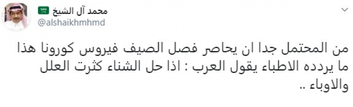 وقال في تغريدة عبر "تويتر" رصدها "المشهد العربي": "من المحتمل جدًا أن يحاصر فصل الصيف فيروس كورونا هذا ما يردده الأطباء يقول العرب: إذا حل الشتاء كثرت العلل والأوباء".