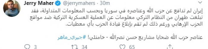 وكتب في تغريدة عبر "تويتر" رصدها "المشهد العربي": "إيران لم تدافع عن حزب الله وعناصره في سوريا وبحسب المعلومات المتداولة، فقد تبلغت طهران من النظام التركي معلومات عن العملية العسكرية التركية ضد مواقع الحزب الإرهابي ورغم ذلك لم تقم بإبلاغ قيادة الحزب بأي معطيات. عناصر حزب الله ضحايا مشاريع حسن نصرالله – خامنئي".