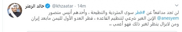 وقال في تغريدة عبر "تويتر" رصدها "المشهد العربي": "لن تجد مدافعاً عن قطر سوى المتردية والنطيحة، وأحدهم أنيس منصور الابن الغير شرعي لتنظيم القاعدة، قطر العدو الأول لليمن ما بعد إيران ومن لا يزال ينظر لغير ذلك فهو أعمى".