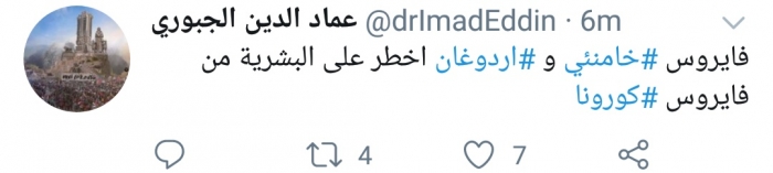 وكتب الجبوري، في تغريدة له عبر موقع التواصل الاجتماعي تويتر، تابعها المشهد العربي: "فيروس خامنئي وأردوغان أخطر على البشرية من فيروس كورونا".