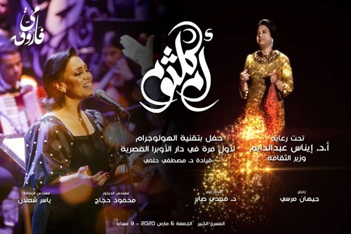 تحيي المطربة مي فاروق أول حفلًا غنائيًا، بتقنيه الهولوجرام لكوكب الشرق أم كلثوم، على المسرح الكبير في دار الأوبرا المصرية.