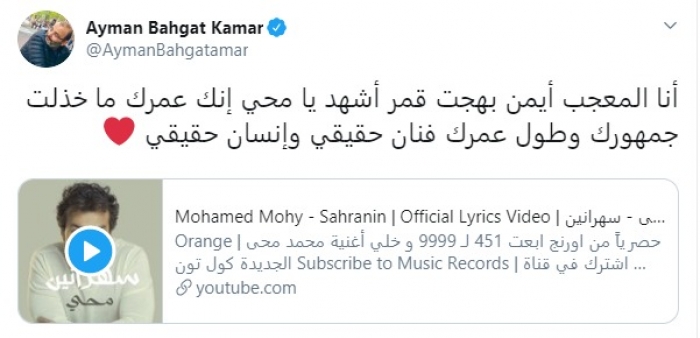 ونشر "قمر" الأغنية عبر حسابه بموقع "تويتر"، وعلق: " أنا المعجب أيمن بهجت قمر أشهد يا محيي إنك عمرك ما خذلت جمهورك وطول عمرك فنان حقيقي وإنسان حقيقي".