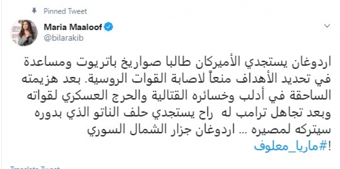 وصفت الإعلامية اللبنانية ماريا معلوف، اليوم، الرئيس التركي رجب طيب أردوغان بجزار الشمال السوري.