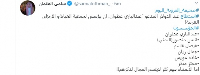 وقال في تغريدة عبر "تويتر" رصدها "المشهد العربي": "استطاع عبد الدولار المدعو عبدالباري عطوان، أن يؤسس لجمعية الخيانة والارتزاق العربية! المؤسسون عبدالباري عطوان أنيس منصور(اليمني) فيصل قاسم جمال ريان غادة عويس معتز مطر أما الأعضاء فهم كثر لا يتسع المجال لذكرهم".