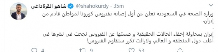 علق الكاتب الصحفي العراقي شاهو القرةداغي، اليوم، على تسجيل وزارة الصحة السعودية لأول إصابة بفيروس كورونا لمواطن قادم من إيران عبر البحرين.