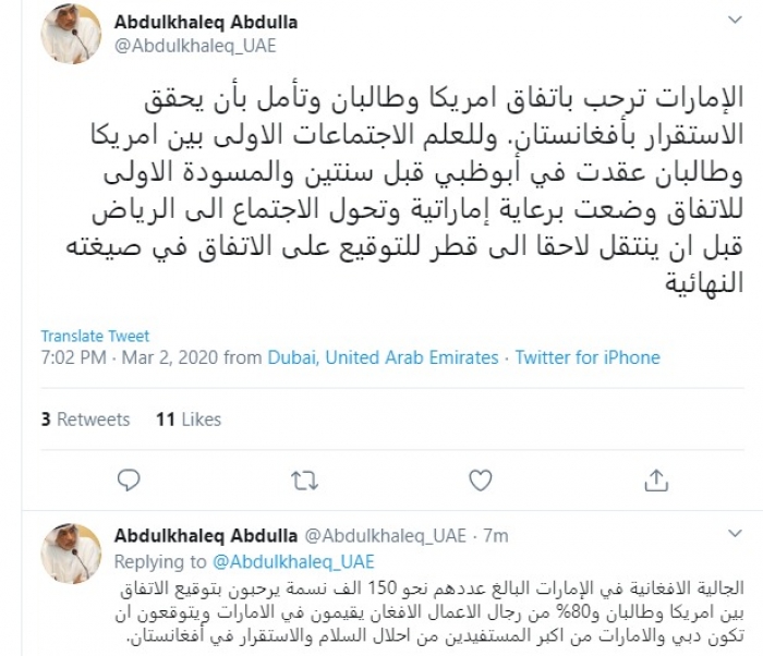 وقال في تغريدات عبر "تويتر" رصدها "المشهد العربي": "الإمارات ترحب باتفاق أمريكا وطالبان وتأمل بأن يحقق الاستقرار بأفغانستان. وللعلم الاجتماعات الأولى بين أمريكا وطالبان عقدت في أبوظبي قبل سنتين والمسودة الأولى للاتفاق وضعت برعاية إماراتية وتحول الاجتماع إلى الرياض قبل أن ينتقل لاحقاً إلى قطر للتوقيع على الاتفاق في صيغته النهائية".