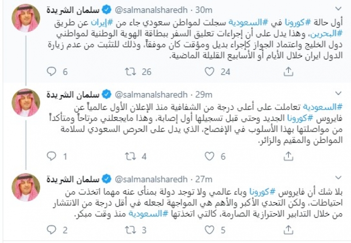 وكتب في تغريدات عبر "تويتر" رصدها "المشهد العربي": "أول حالة كورونا في السعودية سجلت لمواطن سعودي جاء من إيران عن طريق البحرين، وهذا يدل على أن إجراءات تعليق السفر ببطاقة الهوية الوطنية لمواطني دول الخليج واعتماد الجواز كإجراء بديل ومؤقت كان موفقاً، وذلك للتثبت من عدم زيارة الدول ايران خلال الأيام أو الأسابيع القليلة الماضية".