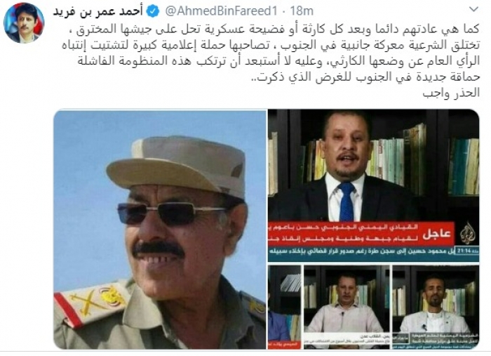 وقال في تغريدة عبر "تويتر" رصدها "المشهد العربي": "كما هي عادتهم دائما وبعد كل كارثة أو فضيحة عسكرية تحل على جيشها المخترق، تختلق الشرعية معركة جانبية في الجنوب، تصاحبها حملة إعلامية كبيرة لتشتيت انتباه الرأي العام عن وضعها الكارثي، وعليه لا أستبعد أن ترتكب هذه المنظومة الفاشلة حماقة جديدة في الجنوب للغرض الذي ذكرت.. الحذر واجب".