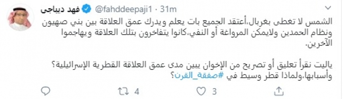 وكتب في تغريدة عبر "تويتر" رصدها "المشهد العربي": "الشمس لا تغطى بغربال، اعتقد الجميع بات يعلم ويدرك عمق العلاقة بين بني صهيون ونظام الحمدين ولا يمكن المرواغة أو النفي، كانوا يتفاخرون بتلك العلاقة ويهاجموا الآخرين".