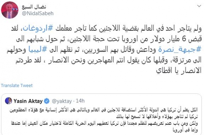 وقال في تغريدة عبر "تويتر" رصدها "المشهد العربي": "ولم يتاجر أحد في العالم بقضية اللاجئين كما تاجر معلمك أردوغان، لقد قبض 6 مليار دولار من أوروبا تحت حجة اللاجئين، ثم حول شبابهم إلى جبهة نصرة وداعش وقاتل بهم السوريين، ثم نقلهم إلى ليبيا وحولهم الى مرتزقة، وقبلها كان يقول أنتم المهاجرين ونحن الأنصار، لقد طردتم الأنصار يا أقطاي".