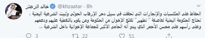 طالب المحلل السياسي السعودي خالد الزعتر، اليوم، بتطهير حكومة الشرعية في اليمن، وإبعاد الإرهابي علي محسن الأحمر.