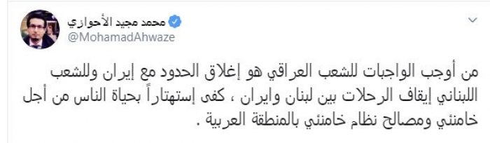 وقال في تغريدة عبر "تويتر" رصدها "المشهد العربي": "من أوجب الواجبات للشعب العراقي هو إغلاق الحدود مع إيران وللشعب اللبناني إيقاف الرحلات بين لبنان وإيران، كفى استهتاراً بحياة الناس من أجل خامنئي ومصالح نظام خامنئي بالمنطقة العربية".