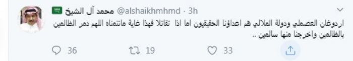 وكتب في تغريدة عبر "تويتر" رصدها "المشهد العربي": "أردوغان العصملي ودولة الملالي هم أعداؤنا الحقيقيون أما إذا تقاتلا فهذا غاية ما نتمناه اللهم دمر الظالمين بالظالمين واخرجنا منها سالمين".