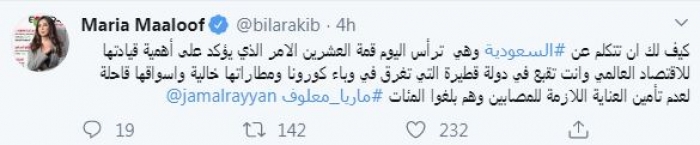 وقالت في تغريدة عبر "تويتر" رصدها "المشهد العربي": "كيف لك أن تتكلم عن السعودية وهي ترأس اليوم قمة العشرين الأمر الذي يؤكد على أهمية قيادتها للاقتصاد العالمي وأنت تقبع في دولة قطيرة التي تغرق في وباء كورونا ومطاراتها خالية وأسواقها قاحلة لعدم تأمين العناية اللازمة للمصابين وهم بلغوا المئات يا جمال ريان".