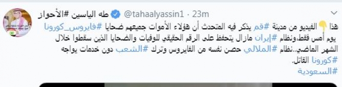 وقال في تغريدة عبر "تويتر" رصدها "المشهد العربي": "هذا الفيديو من مدينة قم يذكر فيه المتحدث أن هؤلاء الأموات جميعهم ضحايا فايروس كورونا يوم أمس فقط، ونظام إيران ما زال يتحفظ على الرقم الحقيقي للوفيات والضحايا الذين سقطوا خلال الشهر الماضي..نظام الملالي حصن نفسه من الفيروس وترك الشعب دون خدمات يواجه كورونا القاتل".