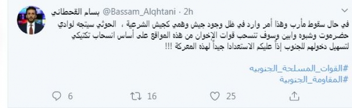وقال في تغريدة عبر "تويتر" رصدها "المشهد العربي": "في حال سقوط مأرب وهذا أمر وارد في ظل وجود جيش وهمي كجيش الشرعية، الحوثي سيتجه لوادي حضرموت وشبوه وأبين وسوف تنسحب قوات الإخوان من هذه المواقع على أساس انسحاب تكتيكي لتسهيل دخولهم للجنوب إذاً عليكم الاستعداد جيداً لهذه المعركة".