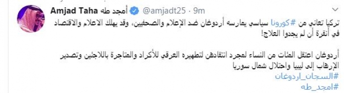 وكتب في تغريدة عبر "تويتر" رصدها "المشهد العربي": "تركيا تعاني من كورونا سياسي يمارسه أردوغان ضد الإعلام والصحفيين، وقد يهلك الإعلام والاقتصاد في أنقرة أن لم يجدوا العلاج! أردوغان اعتقل المئات من النساء لمجرد انتقادهن لتطهيره العرقي للأكراد والمتاجرة باللاجئين وتصدير الإرهاب إلى ليبيا واحتلال شمال سوريا".