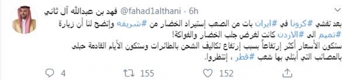 وقال في تغريدة عبر "تويتر" رصدها : "بعد تفشي كورونا في إيران بات من الصعب استيراد الخضار من شريفة واتضح لنا أن زيارة تميم إلى الأردن كانت لغرض جلب الخضار والفواكه! ستكون الأسعار أكثر ارتفاعاً بسبب ارتفاع تكاليف الشحن بالطائرات وستكون الأيام القادمة حبلى بالمصائب التي أبتلي بها شعب قطر انتظروا".