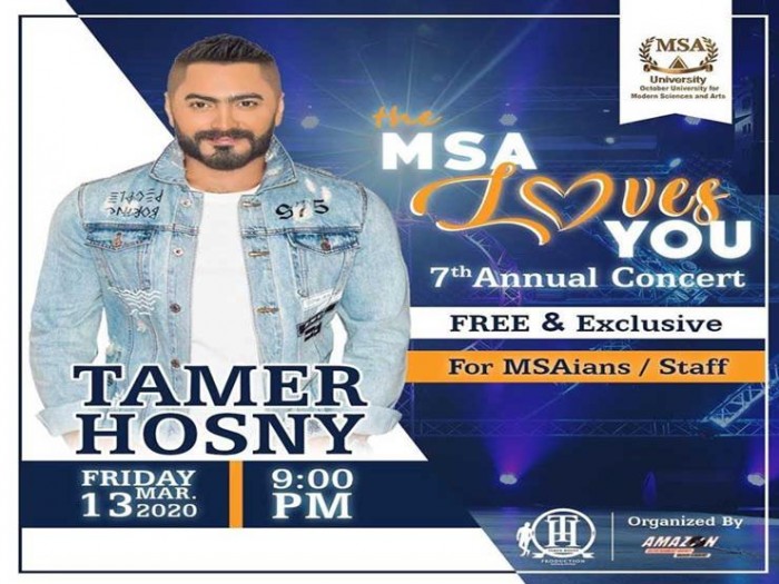 يحيي النجم تامر حسني، حفلا غنائيا يوم الجمعة الموافق 13 مارس، بجامعة العلوم الحديثة والآداب msa، بمدينة السادس من أكتوبر في القاهرة.