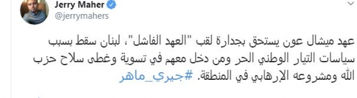 قال الكاتب الصحفي اللبناني جيري ماهر، اليوم، إن عهد الرئس اللبناني ميشال عون يستحق لقب "العهد الفاشل" بجدارة.