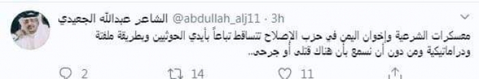 وقال في تغريدة عبر "تويتر" رصدها "المشهد العربي": "معسكرات الشرعية وإخوان اليمن في حزب الإصلاح تتساقط تباعاً بأيدي الحوثيين وبطريقة ملفتة ودراماتيكية ومن دون أن نسمع بأن هناك قتلى أو جرحى".