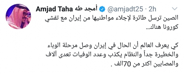 وكتب أمجد طه، في تغريدة له عبر موقع التواصل الاجتماعي تويتر، تابعها المشهد العربي: "الصين ترسل طائرة لإجلاء مواطنيها من إيران مع تفشي كورونا هناك".