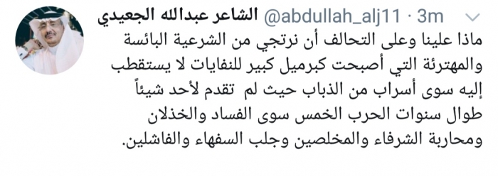 وتساءل الجعيدي، في تغريدة له على موقع التواصل الاجتماعي تويتر، تابعها المشهد العربي: "ماذا علينا وعلى التحالف أن نرتجي من الشرعية البائسة والمهترئة التي أصبحت كبرميل كبير للنفايات لا يستقطب إليه سوى أسراب من الذباب حيث لم تقدم لأحد شيئاً طوال سنوات الحرب الخمس سوى الفساد والخذلان ومحاربة الشرفاء والمخلصين وجلب السفهاء والفاشلين؟".