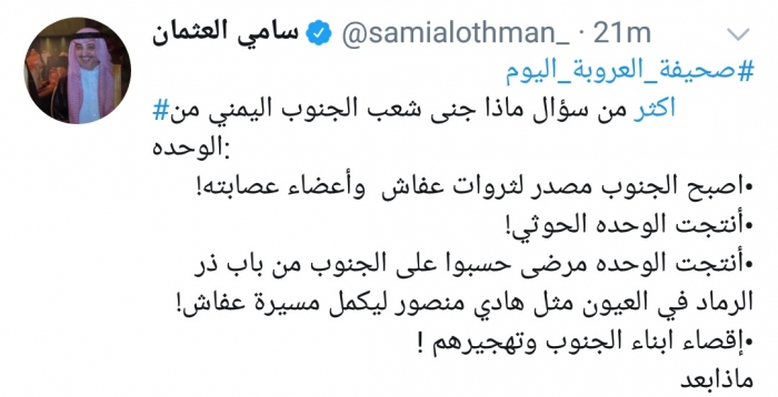 وكتب العثمان، في تغريدة له على موقع التواصل الاجتماعي تويتر، تابعها المشهد العربي: "أكثر من سؤال ماذا جنى شعب الجنوب من الوحدة؟"، مضيفا: "أصبح الجنوب مصدر لثروات عفاش وأعضاء عصابته، وأنتجت الوحدة الحوثي".