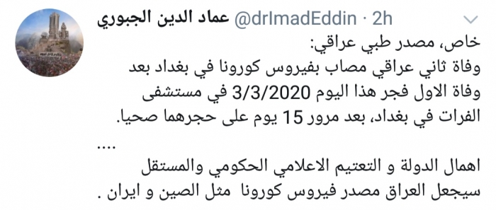 وكتب الجبوري، في تغريدة له على موقع التواصل الاجتماعي تويتر، تابعها المشهد العربي: "وفاة ثاني عراقي مصاب بفيروس كورونا في بغداد بعد وفاة الأول فجر هذا اليوم 3/3/2020 في مستشفى الفرات في بغداد، بعد مرور 15 يوم على حجرهما صحيا".
