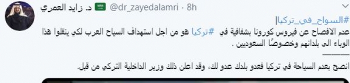 وقال في تغريدة عبر "تويتر" رصدها "المشهد العربي": "السواح في تركيا| عدم الإفصاح عن فيروس كورونا بشفافية في تركيا هو من أجل استهداف السياح العرب لكي ينقلوا هذا الوباء إلى بلدانهم وخصوصًا السعوديين. أنصح بعدم السياحة في تركيا فعدو بلدك عدو لك، وقد أعلن ذلك وزير الداخلية التركي من قبل".