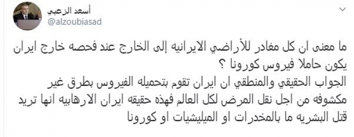 وكتب في تغريدة عبر "تويتر" رصدها "المشهد العربي": "ما معنى أن كل مغادر للأراضي الإيرانية إلى الخارج عند فحصه خارج إيران يكون حاملاً فيروس كورونا؟ الجواب الحقيقي والمنطقي أن إيران تقوم بتحميله الفيروس بطرق غير مكشوفه من أجل نقل المرض لكل العالم فهذه حقيقه إيران الإرهابية أنها تريد قتل البشرية إما بالمخدرات أو الميليشيات أو كورونا".