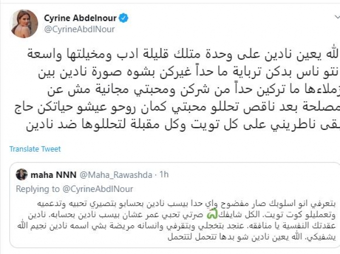 ومع اشتعال الأزمة، اضطرت سيرين للرد على إحدى الفتيات التي تعدت عليها لفظيًا، فقالت لها: "الله يعين نادين على وحدة متلك قليلة أدب ومخيلتها واسعة، إنتوا ناس بدكن ترباية ما حدا غيركن بيشوه صورة نادين بين زملائها، ما تاركين حدا من شركن ومحبتي مجانية مش عن مصلحة، بعد ناقص تحللوا محبتي كمان، روحوا عيشوا حياتكن حاج بقى ناطرني على كل تويت وكل مقبلة لتحللوها ضد نادين".