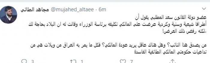 وقال في تغريدة عبر "تويتر" رصدها "المشهد العربي": "عضو دولة القانون سعد المطلبي يقول أن أطرافاً شيعية وسنية وكردية عرضت على المالكي تكليفه برئاسة الوزراء وقالت له أن البلاد بحاجة لك، لكنه رفض ذلك العرض".