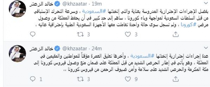 وقال في تغريدات عبر "تويتر" رصدها "المشهد العربي": "عدة إجراءات احترازية اتخذتها السعودية، وآخرها تعليق العمرة مؤقتاً للمواطنين والمقيمين في المملكة، وهو يأتي في إطار الحرص الشديد من قبل المملكة على ضمان منع وصول فيروس كورونا إلى مكة المكرمة والحرص الشديد على سلامة وأمن ضيوف الرحمن من فيروس كورونا".