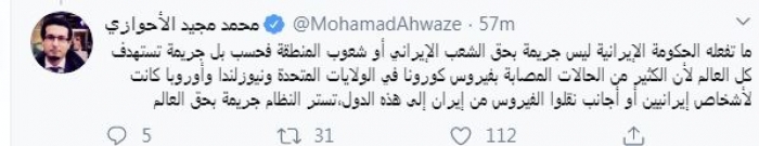 قال الكاتب الصحفي محمد مجيد الأحوازي، اليوم، إن ما تفعله حكومة إيران بشأن التستر على فيروس كورونا جريمة تستهدف العالم أجمع.