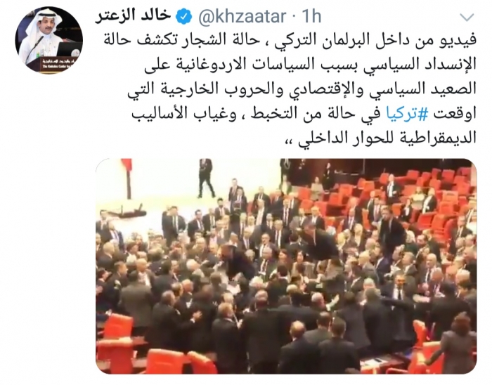 وكتب الزعتر، في تغريدة له عبر موقع التواصل الاجتماعي تويتر، تابعها المشهد العربي: "فيديو من داخل البرلمان التركي، حالة الشجار تكشف حالة الانسداد السياسي بسبب السياسات الأردوغانية على الصعيد السياسي والاقتصادي والحروب الخارجية التي أوقعت تركيا في حالة من التخبط، وغياب الأساليب الديمقراطية للحوار الداخلي".