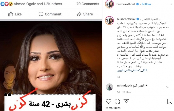 وكتبت بشرى عبر حسابها الرسمي بموقع إنستجرام: "بالنسبة للناس والويكيبيديا اللي مصرين يكبروني بالعافية، صحيح إن خبرتي في الحياة تعمل ٧٢ مش بس ٤٢ بس يا جماعة مستعجلين على إيه، ما إحنا كدة كدة رايحين رايحين وخصوصا مع جنون الأوبئة اللي هبت علينا".