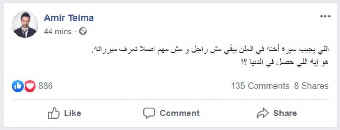وكتب أمير طعيمة، عبر حسابه بموقع فيس بوك، قائلاً: "اللى يجيب سيرة أخته فى العلن يبقى مش راجل ومش مهم أصلاً تعرف مبرراته هو إيه اللى حصل فى الدنيا؟".