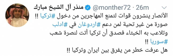 وكتب مبارك، في تغريدة له على موقع التواصل الاجتماعي تويتر، تابعها المشهد العربي: "الأنصار ينشرون قوات لتمنع المهاجرين من دخول تركيا".