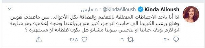 وكتبت: "إذا أنا باخد الاحتياطات المتعلقة بالتعقيم والنضافة بكل الأحوال، بس ماعندي هوس وهلع ورعب الكورونا اللي حاسة إنه جزء كبير منه بروباجندا وضجة إعلامية، ومو شايفة إنو لازم نوقف حياتنا أو ننحبس ببيوتنا مشانو هل بكون غلطانة أو مستهترة".