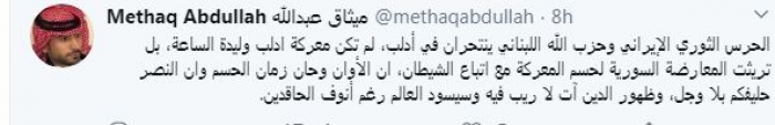 وكتب في تغريدة عبر "تويتر" رصدها "المشهد العربي": "الحرس الثوري الإيراني وحزب الله اللبناني ينتحران في إدلب، لم تكن معركة إدلب وليدة الساعة، بل تريثت المعارضة السورية لحسم المعركة مع أتباع الشيطان، آن الأوان وحان زمان الحسم وأن النصر حليفكم بلا وجل، وظهور الدين آت لا ريب فيه وسيسود العالم رغم أنوف الحاقدين".