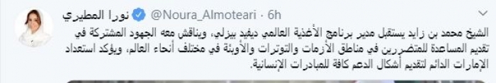 وقالت في تغريدة عبر "تويتر" رصدها "المشهد العربي": "الشيخ محمد بن زايد يستقبل مدير برنامج الأغذية العالمي ديفيد بيزلي، ويناقش معه الجهود المشتركة في تقديم المساعدة للمتضررين في مناطق الأزمات والتوترات والأوبئة في مختلف أنحاء العالم، ويؤكد استعداد الإمارات الدائم لتقديم أشكال الدعم كافة للمبادرات الإنسانية".