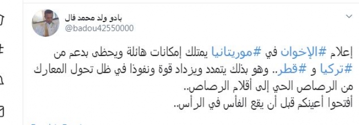 وكتب في تغريدة عبر "تويتر" رصدها "المشهد العربي": "إعلام الإخوان في موريتانيا يمتلك إمكانات هائلة ويحظى بدعم من تركيا وقطر.. وهو بذلك يتمدد ويزداد قوة ونفوذا في ظل تحول المعارك من الرصاص الحي إلى أقلام الرصاص.. افتحوا أعينكم قبل أن يقع الفأس في الرأس".