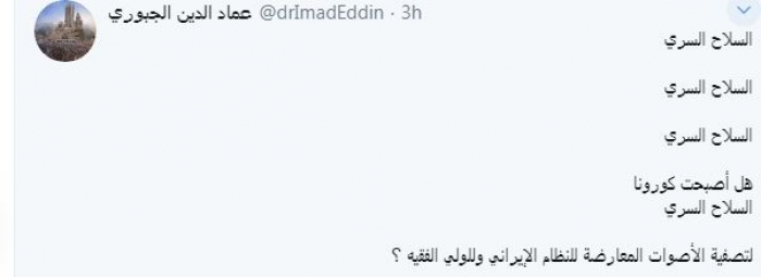 وقال في تغريدة عبر "تويتر" رصدها "المشهد العربي": "السلاح السري.. هل أصبحت كورونا السلاح السري لتصفية الأصوات المعارضة للنظام الإيراني وللولي الفقيه؟".