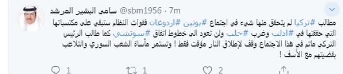 وكتب في تغريدة عبر "تويتر" رصدها "المشهد العربي": "مطالب تركيا لم يتحقق منها شيء في اجتماع بوتين أردوغان فقوات النظام ستبقي على مكتسباتها التي حققتها في إدلب وغرب حلب ولن تعود إلى خطوط اتفاق سوتشي كما طالب الرئيس التركي ماتم في هذا الاجتماع وقف لإطلاق النار مؤقت فقط وتستمر مأساة الشعب السوري والتلاعب بقضيتهم مع الأسف".