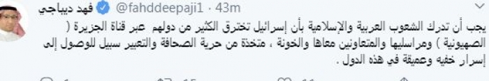 وكتب في تغريدة عبر "تويتر" رصدها "المشهد العربي": "يجب أن تدرك الشعوب العربية والإسلامية بأن إسرائيل تخترق الكثير من دولهم عبر قناة الجزيرة (الصهيونية) ومراسليها والمتعاونين معاها والخونة، متخذة من حرية الصحافة والتعبير سبيل للوصول إلى أسرار خفية وعميقة في هذه الدول".