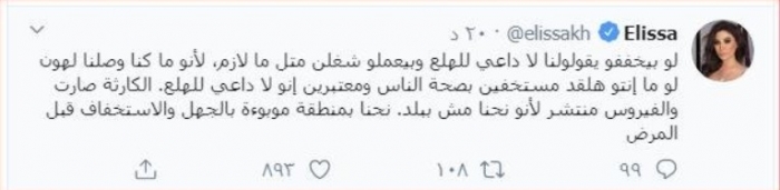 هاجمت الفنانة اللبنانية إليسا، الحكومة اللبنانية بسبب انتشار فيرس "كورونا"، من خلال حسابها بموقع التديونات القصيرة "تويتر"، إذ قالت: "اعملوا شغلكن مثل ما لازم".