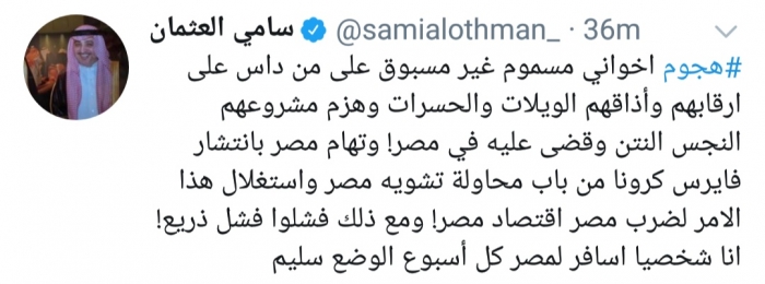 وكتب العثمان، في تغريدة له عبر موقع التواصل الاجتماعي تويتر، تابعها المشهد العربي: "هجوم إخواني مسموم غير مسبوق على من داس على أرقابهم وأذاقهم الويلات والحسرات وهزم مشروعهم النجس النتن وقضى عليه في مصر".