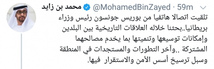 وكتب بن زايد، في تغريدة له عبر موقع التواصل الاجتماعي تويتر، تابعها المشهد العربي: "تلقيت اتصالا هاتفيا من بوريس جونسون رئيس وزراء بريطانيا.. بحثنا خلاله العلاقات التاريخية بين البلدين وإمكانات توسيعها وتنميتها بما يخدم مصالحهما المشتركة.. وآخر التطورات والمستجدات في المنطقة وسبل ترسيخ أسس الأمن والاستقرار فيها".